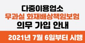 지난해 2021년 7월부터 다중이용업체 무과실 화재배상책임보험 의무가입이 법으로 정해졌다고 합니다.중이용업체에서 화재로 인한 피해가 발생한 경우, 사업주 과실이 없는 경우라도 피해자에게 손해를 보상하도록 피해보상 범위를 확대한 ‘무과실 화재배상책임보험’ 의무가입이 시행되었습니다.