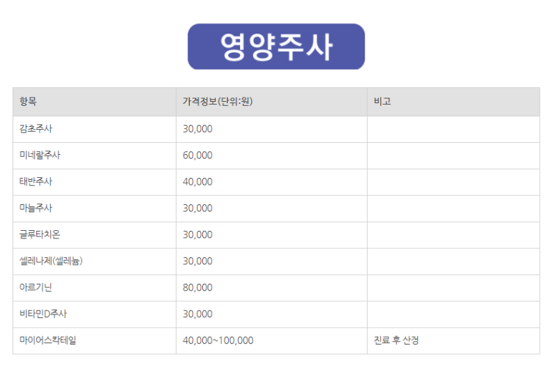 1회 5회 10회 일반영양주사 부족한 영양소 보충으로 일상의 피로회복 및 효과개선 48,000원 240,000원 → 190,000원 480,000원 → 380,000원 78,000원 390,000원 → 290,000원 780,000원 → 590,000원 슬리밍 지방, 내장 지방 정화 및 불필요한 혈관 독소 및 체내 지방 독소 관리 슬리밍 주사 70,000원 8원 1,000원 390,000원 → 290,000원 블루 50000, 컬러는 결핍되기 쉬움, 노화방지 및 질병예방(체지방감소) 성분함유 칵테일주스 12만원 60만원 → 55만원 120만원 → 80만원