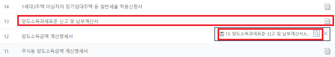 Capital Gains Tax Base Report and Payment Invoice 옆에 있는 종이 버튼을 클릭한 후 HWP 파일을 다운로드합니다. 받을 수 있습니다.