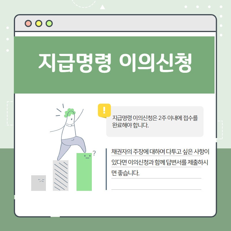 지급명령이 만료된 후 일반소송절차로 이관되며, 이후 청구금액에 따라 3,000만원 미만의 경우 소액사건, 3,000만원 미만의 경우 소액사건으로 분류 단일 청구로 분류됩니다. 5억원, 5억원을 초과하는 경우는 합의사건으로 소송이 계속되며, 채무자는 일반소송과 같이 피고인으로서 법원에 청구를 할 수 있습니다. 납부서에 이의가 있는 경우에는 도장을 찍고 운임을 지불할 필요가 없으며, 이의가 있는 경우에는 납부서에 이의를 제기한 날로부터 30일 이내에 구체적인 사유를 적은 서면 답변서를 제출해야 합니다. 지불 전표 및 원본 지불 전표 수령. 해야만한다. 그러나 이의 신청서를 제출할 수 있습니다.주요 지불 명령에 반대하는 이유