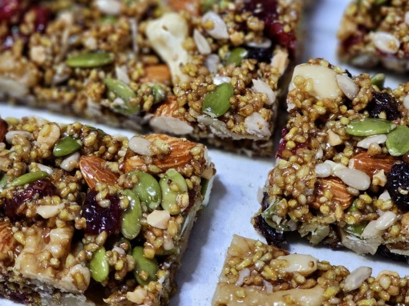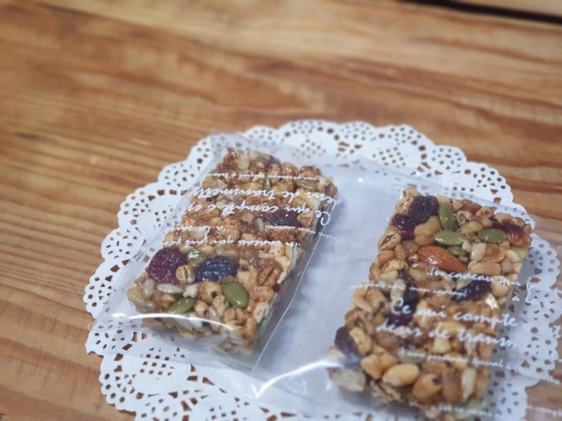 아몬드, 호두, 캐슈넛, 호박씨, 해바라기씨, 땅콩, 건포도, 크랜베리, 볶음밥, 메밀 등 건강한 견과류를 듬뿍 넣어 만들었습니다. 현미와 보리밥 대신 볶음밥과 메밀을 넣었습니다.