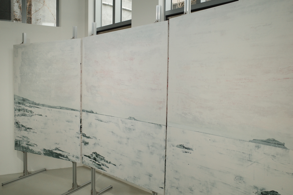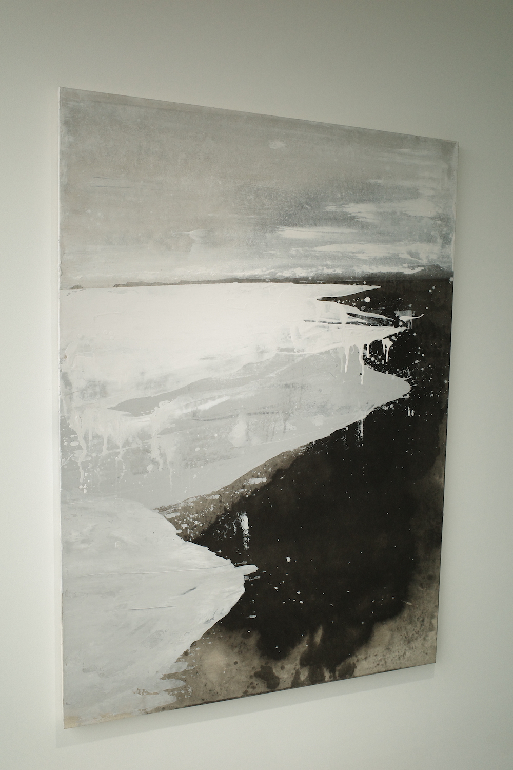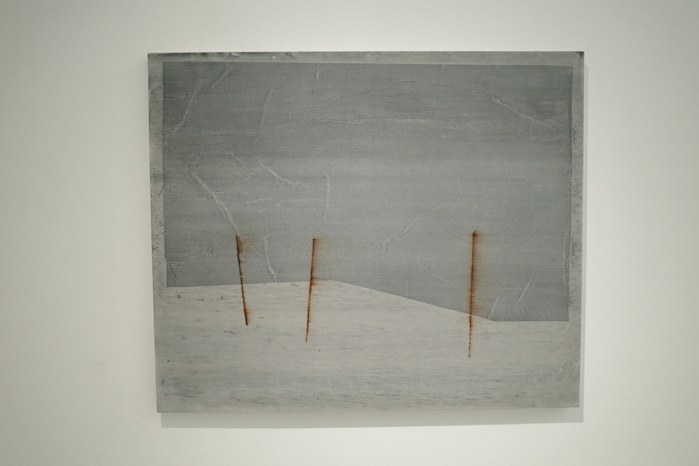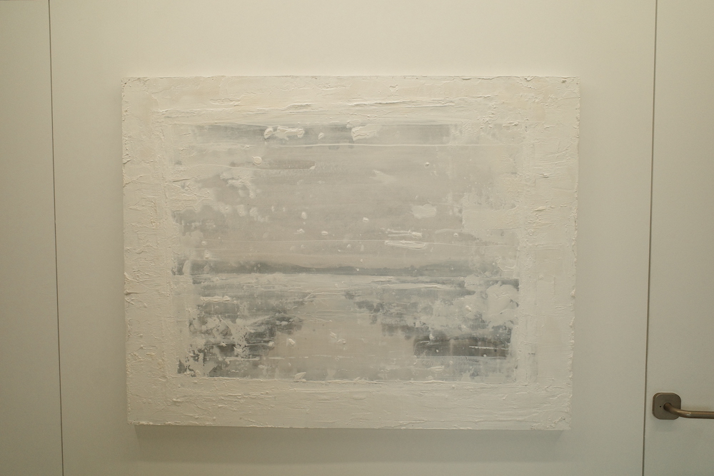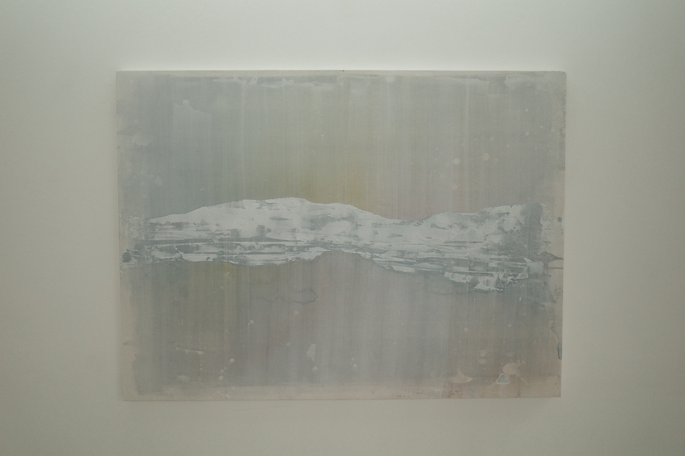 이번 전시에서 가장 눈에 띄는 작품. 일부러 붓으로 그렸고 우연에 의지한 듯 물감을 쏟은 것처럼 보이지 않고, 캔버스 전체를 바라보며 하늘과 모래사장, 바다(혹은 호수)를 마음에 새긴다. . 하늘과 물에서 푸른빛이 거의 사라지고 쓸쓸한 이미지만 남았다.