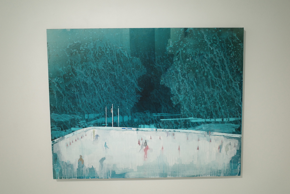 아이스링크의 풍경을 그린 두 작품. 칙칙한 파란색 배경의 링크(아마도 밤)와 낮의 링크는 무성한 녹지입니다. 인상적이었던 것은 밤의 풍경을 흩뿌리거나 흐르는 색의 형태로 표현했다는 점이다. 하지만 나뭇가지에 무성한 잎사귀와 얼어붙은 빙상이 공존할 수 있을까 싶었다. 앞쪽의 초록 친구들은 상록수지만 뒤쪽에 어렴풋이 보이는 노랗고 붉은 잎은 초가을 같지 않다.